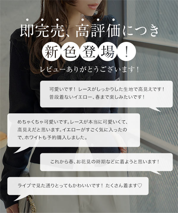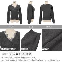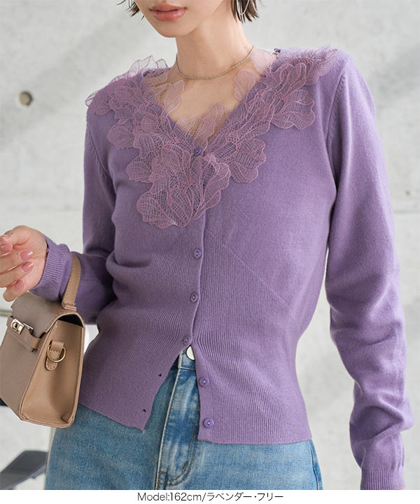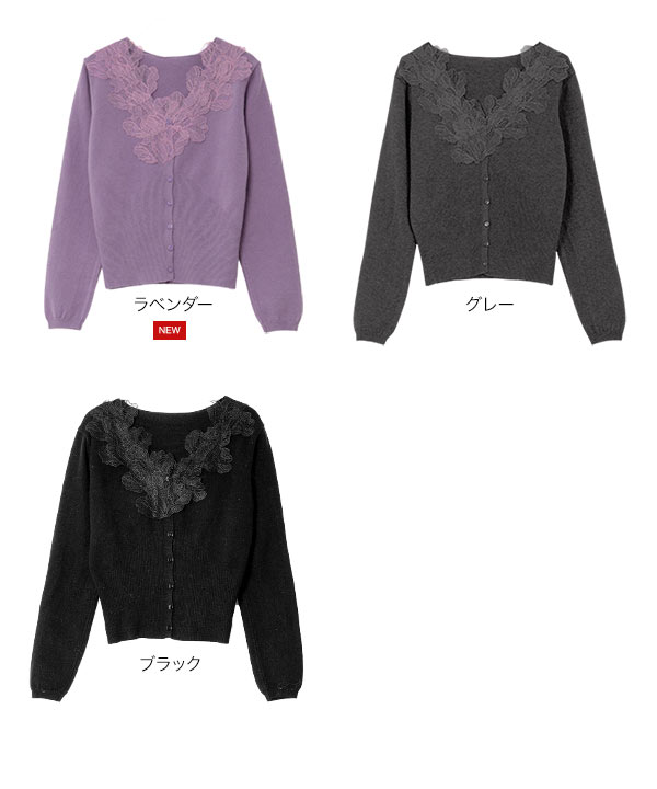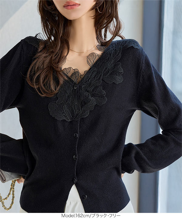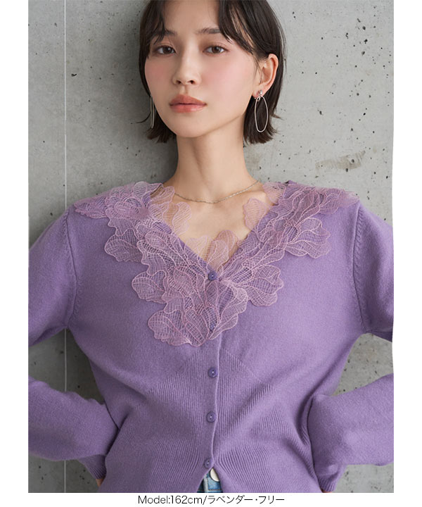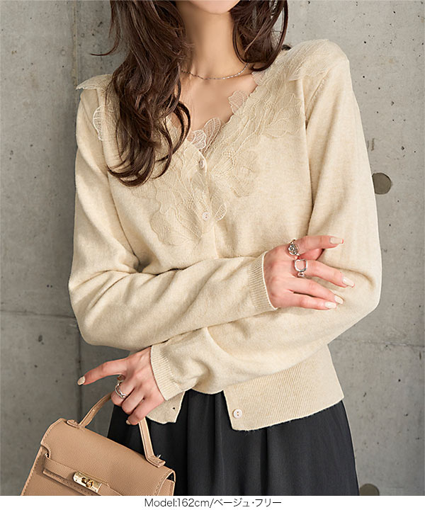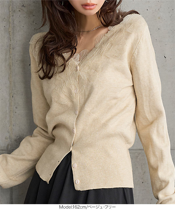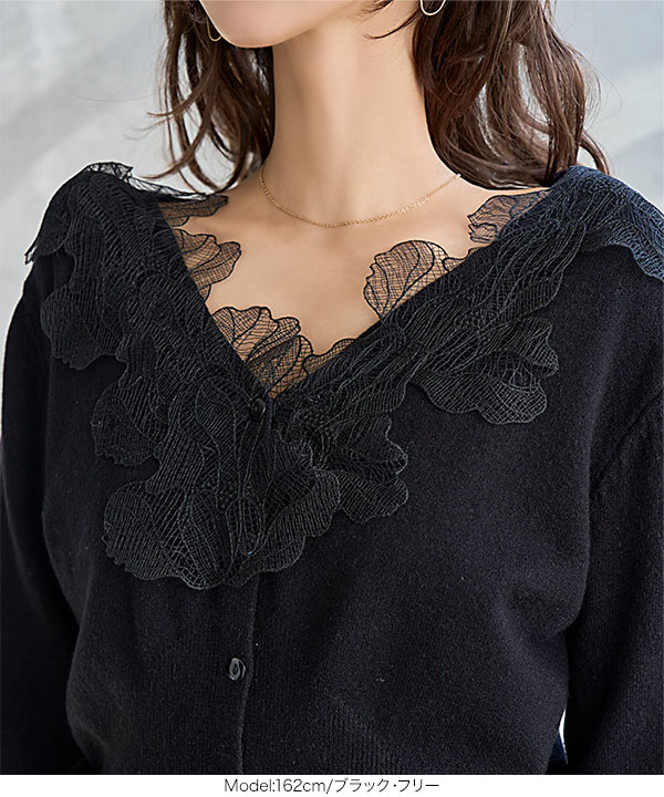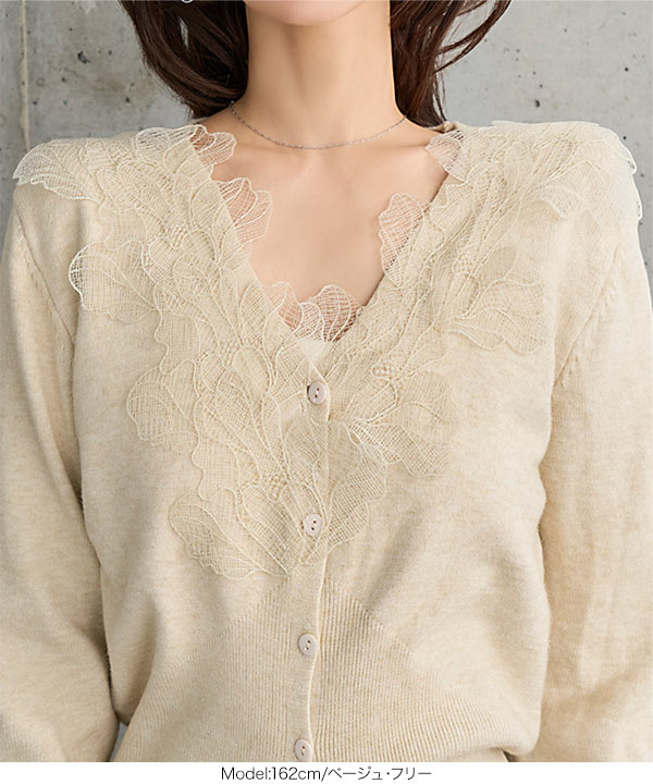 襟元にあしらったレースが華やかさと上品さを添える、レディースニットカーディガン。