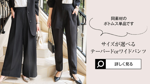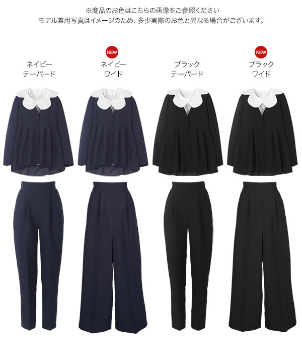 ペプラムジャケット/テーパードorワイドパンツ/フレアブラウス/付け襟の4点セットスーツ。