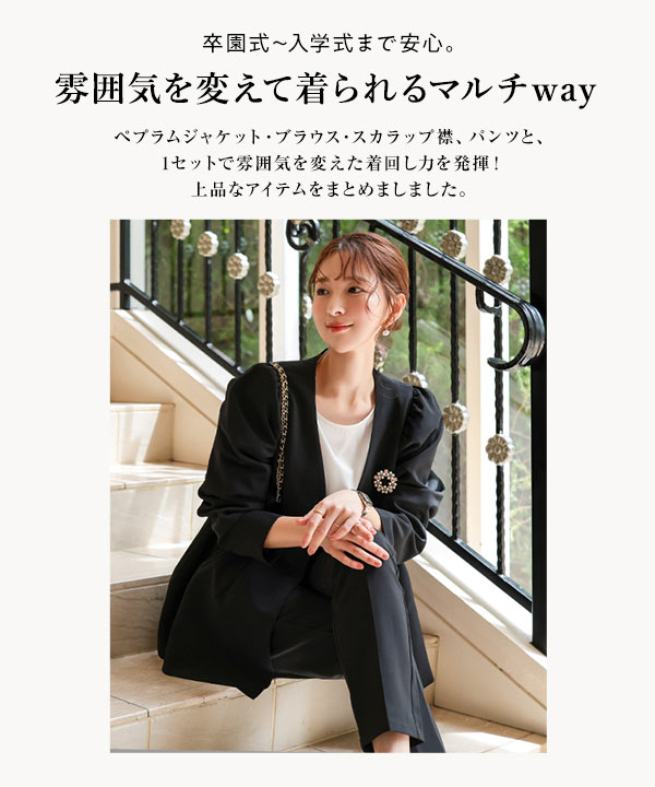 商品カテゴリ:20代 2way 30代 40代 50代 スーツ スカラップ スカラップ襟 セット セットアップ セレモニー ハレの日 フォーマル ブラウス ペプラム ペプラムジャケット ママ ママスーツ レディース 襟 卒園式 卒業式 着痩せ 入園式 入学式 付け襟 母