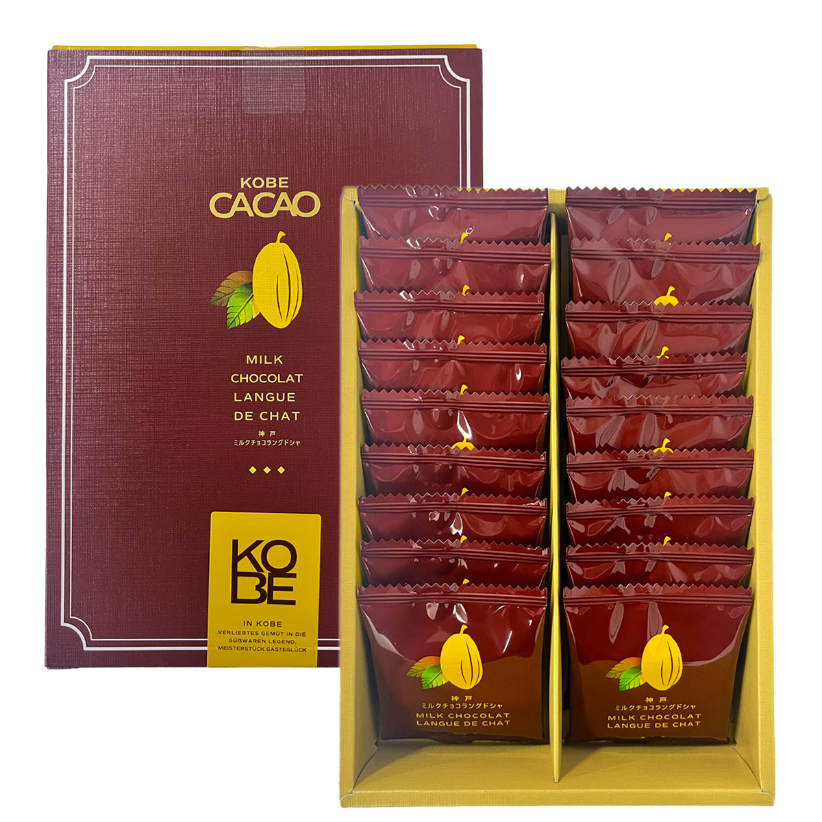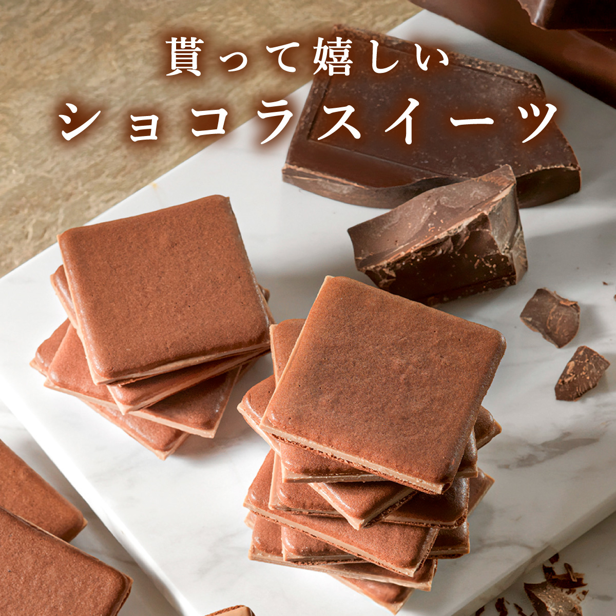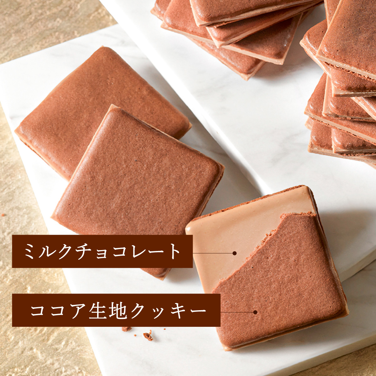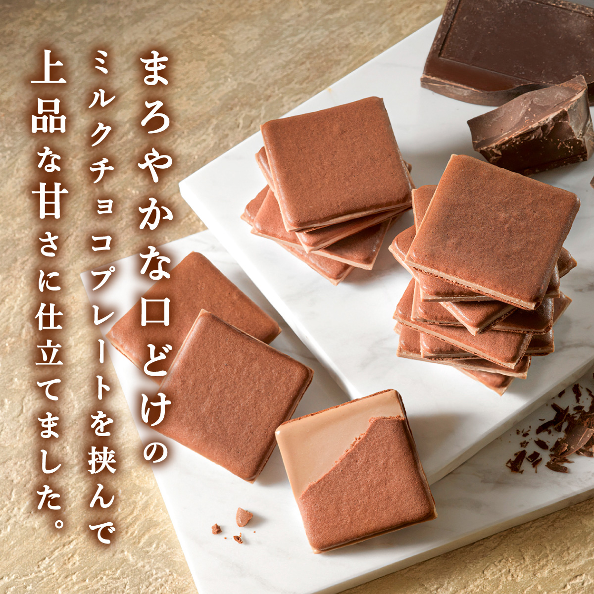 まろやかな口どけのミルクチョコプレートを挟んで上品な甘さに仕立てました。