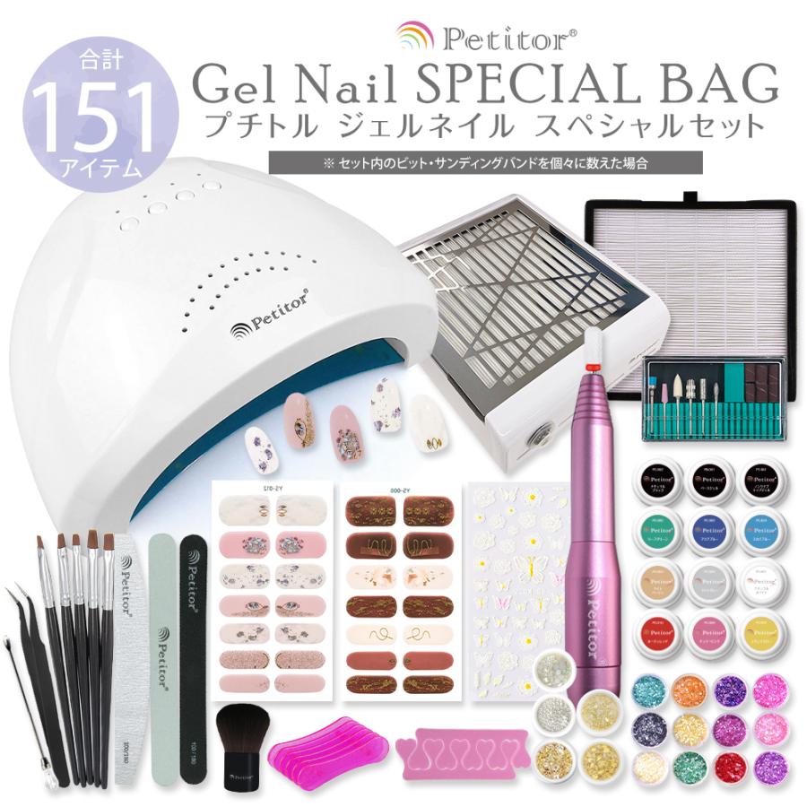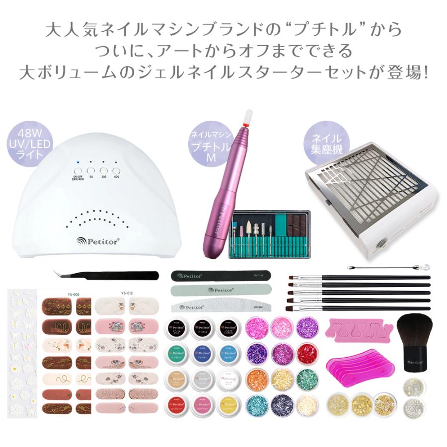 ジェルネイルキット ネイルセット 合計151点 初心者スターターキット セルフネイル ネイルマシン 48W uvライト 集塵機 プチトルM カラージェル10色 petitor