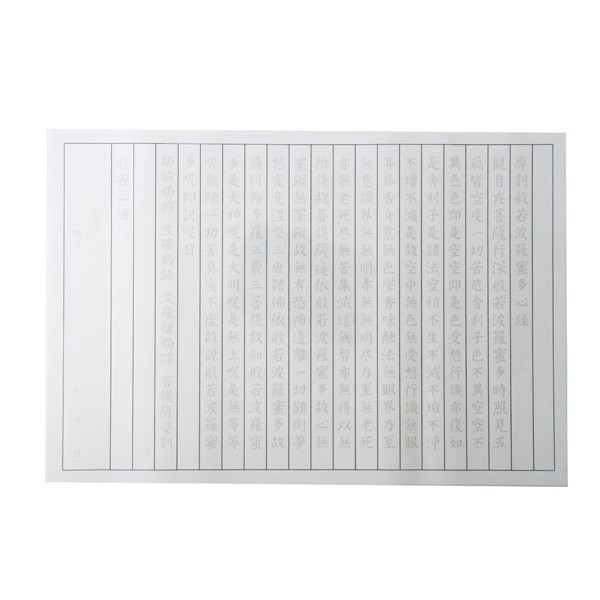 土佐和紙を採用した高級写経用紙、写経用に独自に開発された土佐和紙を採用しています。薄く印刷されている般若心経をなぞっていただく写経初心者にもおすすめなタイプになります。般若心経は初心者でも書きやすい楷書体で印刷されていますのでどなたでもお気軽に写経を始める事が可能となっています。