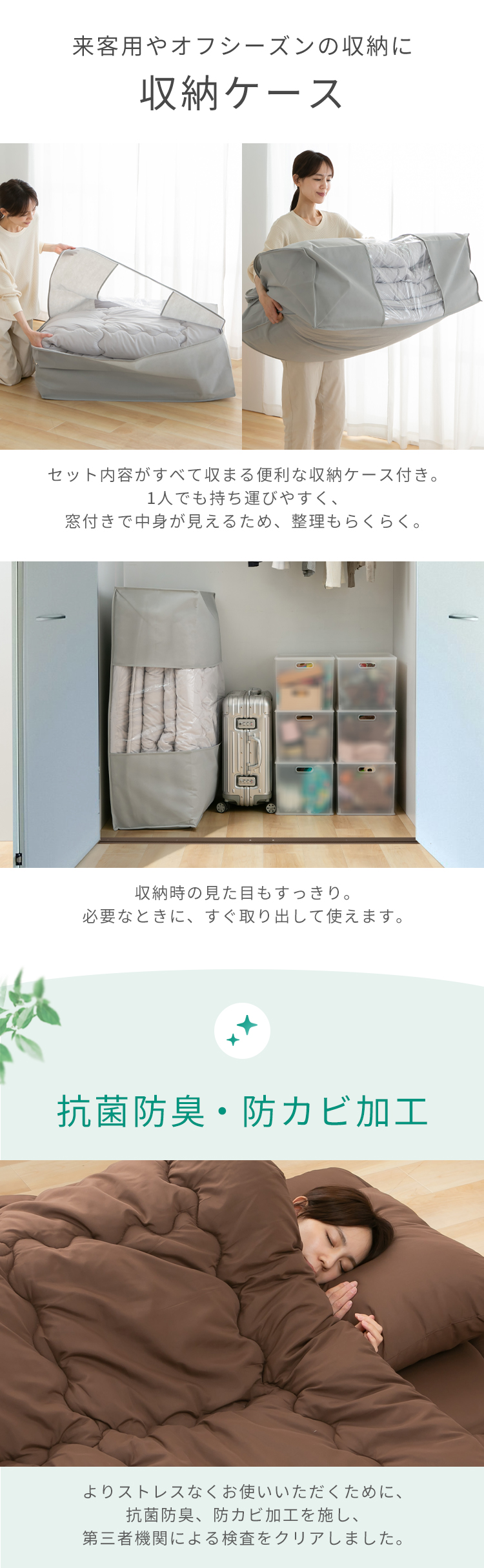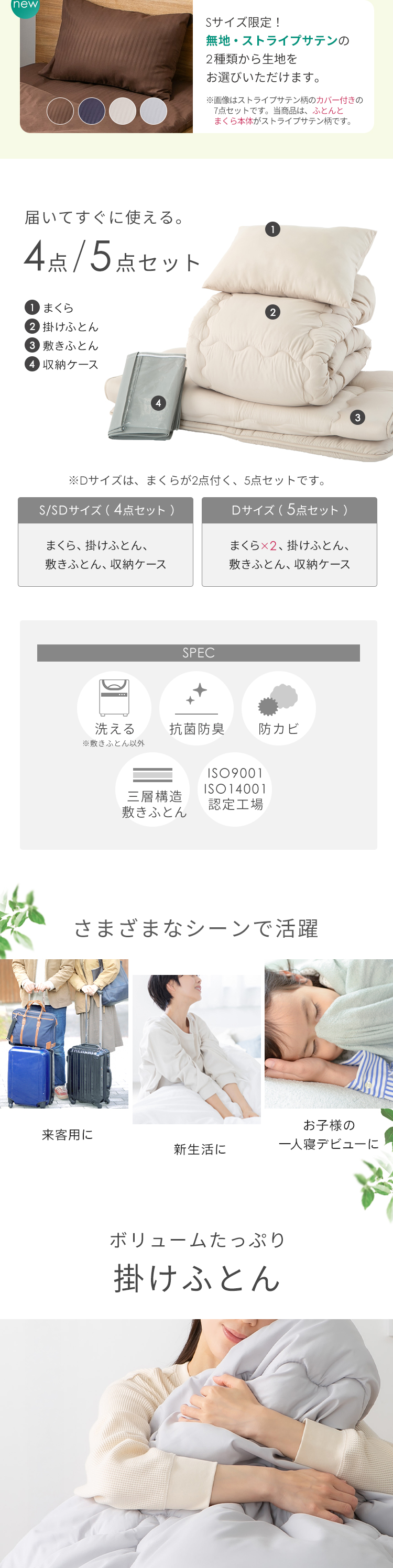 掛布団・敷布団・枕と収納袋がセットになっています。
