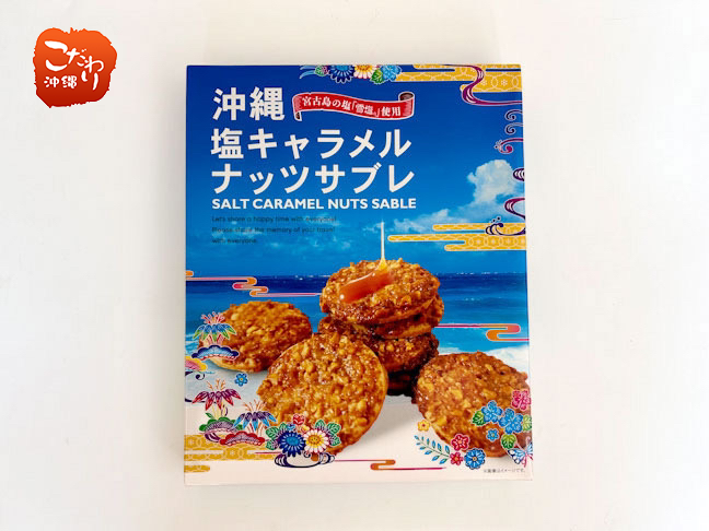特徴:宮古島の雪塩を使用した塩キャラメルをサクサクのナッツサブレにコーティング。