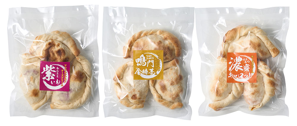 徳島を代表する鳴門金時をはじめ、色鮮やかな紫芋や濃厚な味わいの人参などの素材の持ち味を活かし、やさしい甘さのチーズクリームを加えて手包みで仕上げたカルツォーネピザ。