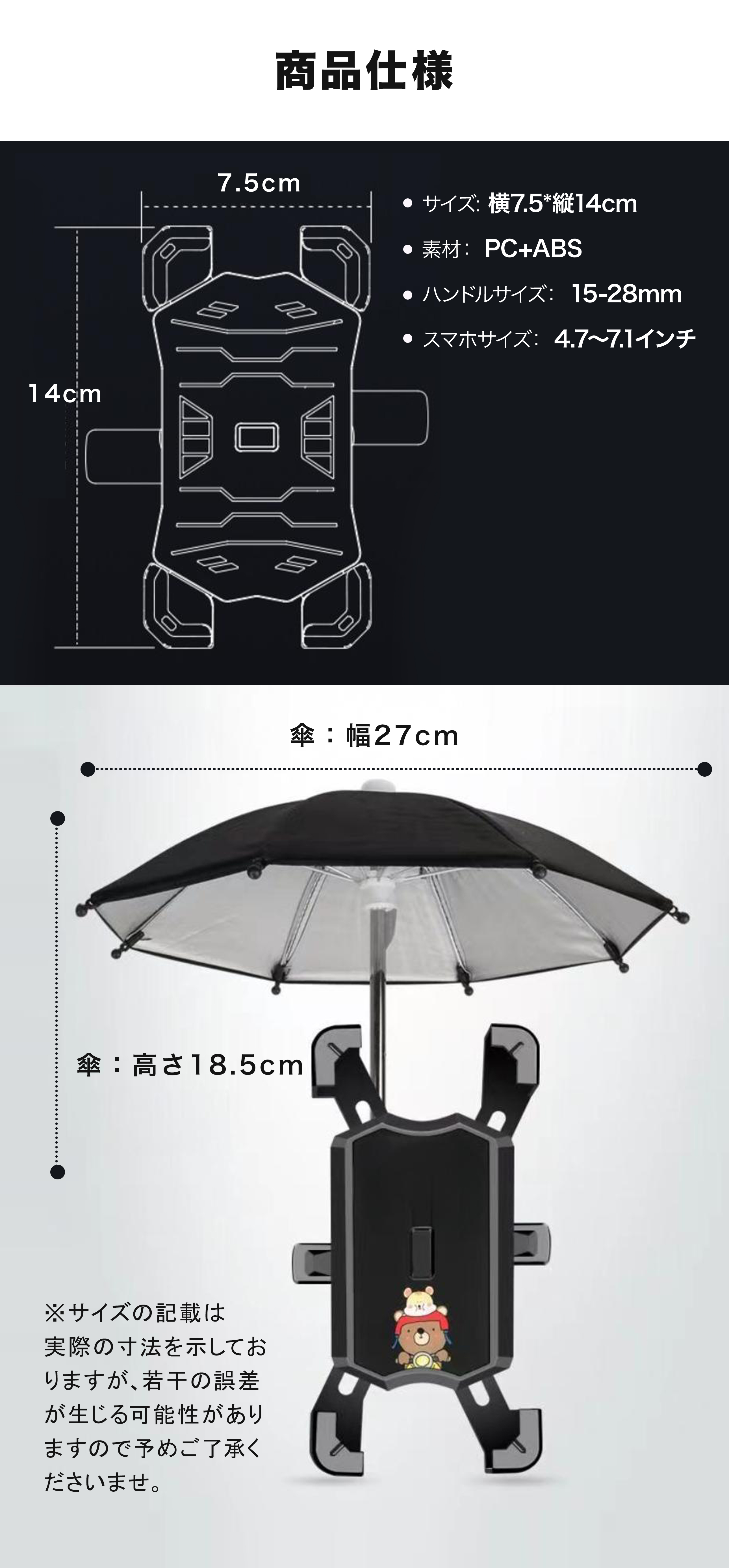 自転車 スマホホルダー バイク 携帯ホルダー ワンタッチ 秒速ロック 360度回転 サイクリング ロードバイク 傘付き 晴雨兼用 オートバイ 車 取り付け簡単