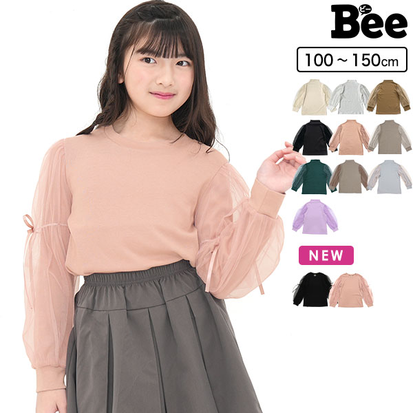 チュール袖トップス 長袖 子供服 キッズ ジュニア 女の子 レース ハーフハイネック 無地 100 110 120 130 140 150
