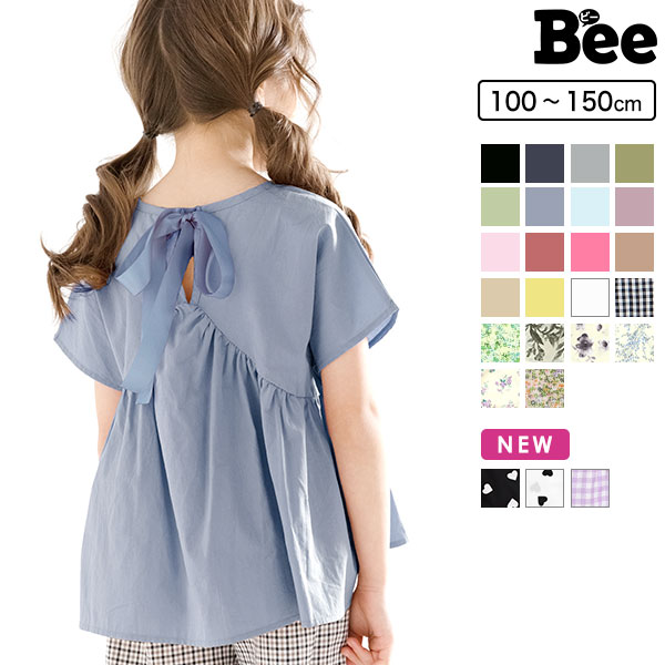 バックリボントップス ブラウス 半袖 子供服 キッズ ジュニア 女の子 無地 花柄 チェック柄 ハート柄 100 110 120 130 140 150