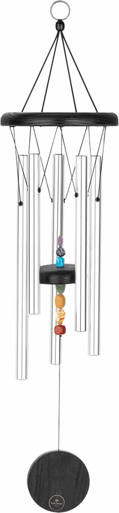 メディテーション・チャイムは、上部アルミリングから吊り下げするか、片手で持って移動しながら演奏する楽器です。チャイムを鳴らすときは、下部コードを軽く横に傾けて音をコントロールします。中央の振り子の下にある調節可能なクリップを上下に動かして、音数の回数を変えたり(振り子が高いほど叩く回数は少なくなる)、完全に止めたり(振り子を上部側に配置した時)することができます。バーを鳴らすクリップ周囲に、7つのチャクラに合わせた色違いの天然石をあしらったチャイムです。5本バーで、優れた共鳴と長い残響、明るめなサウンドを特徴としています。上部ホルダー部にはアッシュ材を採用しています。