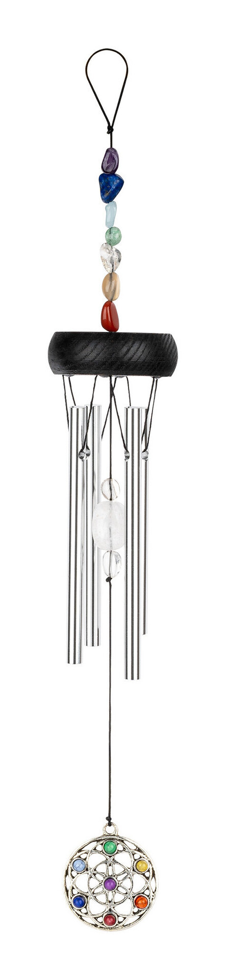 全長12インチのコンパクトなウインドチャイム。上部の7つのストーンはそれぞれチャクラカラーに彩られ、下部コード先端にはそれぞれエスニックなシンボルの装飾が備え付けられています。アルミニウムのバーはきらびやかで澄んだ音色で、軽く、プレゼント用途としても最適です。