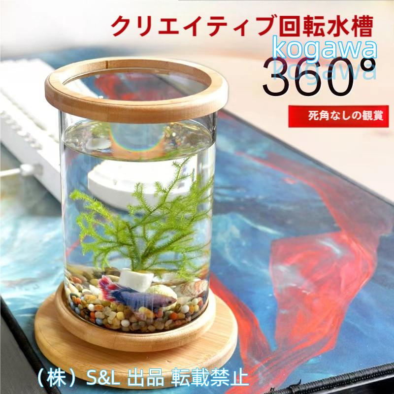 金魚鉢 卓上 360回転 回る水槽 水藻付き LRDライト ガラス+回転台+水藻 すいそう おしゃれ かわいい ベタ水槽 水槽台株式会社S&L オブジェ 円柱 丸形金魚メダカ