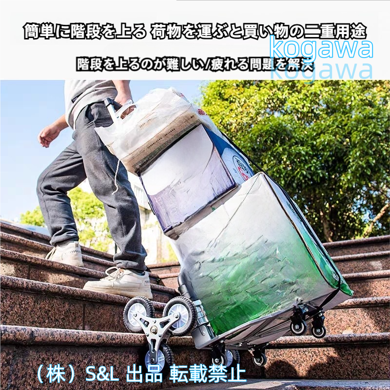 【階段の昇降の荷物運搬に最適】6つのキャスターがついており、そのうち4つは常に地面や段差についているので、引っ張れば楽に階段の上り下りができます。ご自身で4つのキャスターをカートに取り付けてください。