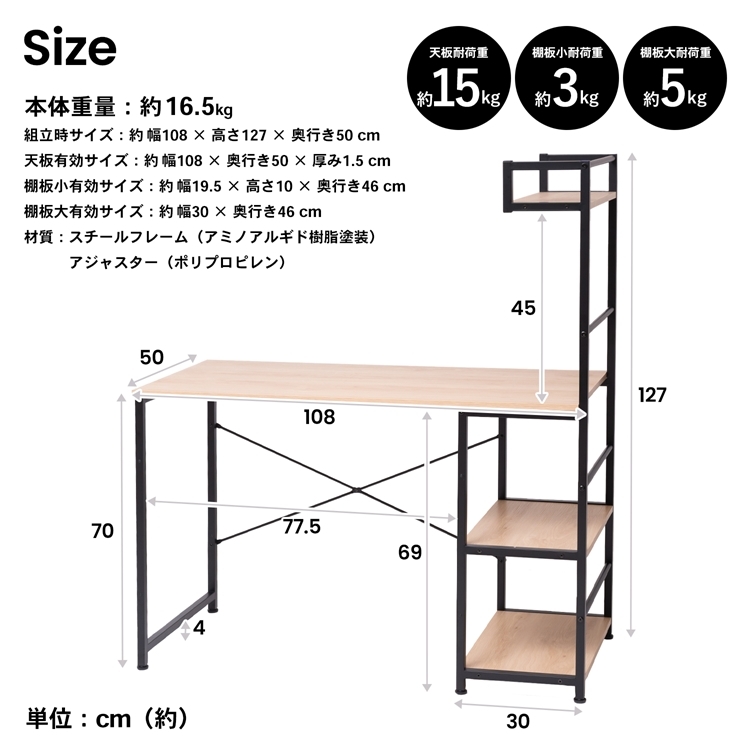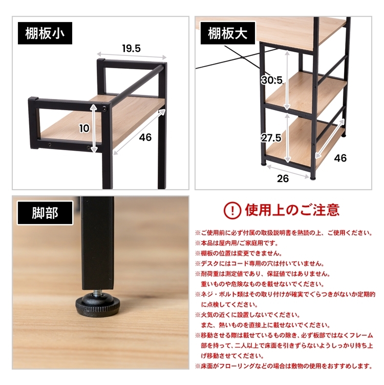 o収納・インテリア o収納用品 o棚・ラック oOAデスク o新生活・収納用品 oテレワーク oひとり暮らし oブラック ◇◇ 【サイズ】幅111×奥行50×高さ127cm 【仕様】 ●耐荷重:天板15kg、上棚3kg、中・下棚5kg ●サイズ(約):幅111×奥行50×高さ127cm ●カラー:ブラック/ナチュラル
