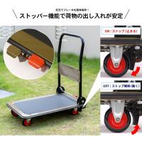 o作業用品 o台車 oカート o新生活・台車 oアウトドア o引越 oアウトドア雑貨 ◇◇ 完成品 【仕様】 ●使用時サイズ(約):幅47.5×奥行73×ハンドル高さ82(cm) ●収納時サイズ(約):幅47.5×奥行73×高さ24(cm) ●重量(約):9.5kg ●耐荷重:約150kg ※耐荷重は測定値であり保証値ではありません。 ●材質 荷台、ハンドル、ブレーキ:スチール 荷台粘着シート:塩化ビニル樹脂 キャスター:ポリプロピレン、ポリウレタン ●屋外用 ※屋内で使用する場合、床材の材質によってはキャスター痕がつくことがあります。