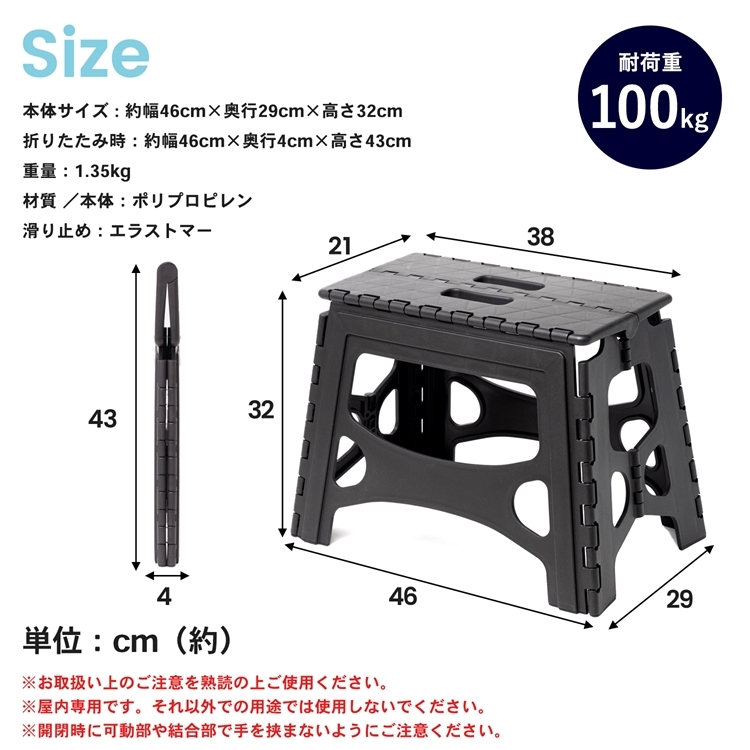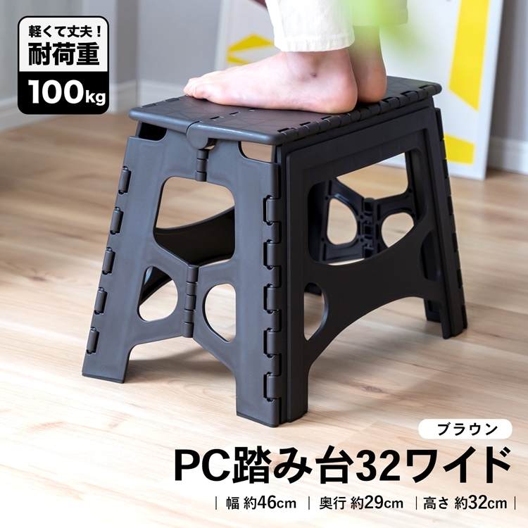 o作業用品 o踏み台・脚立 o新生活・踏み台・脚立 ◇◇ 【サイズ】約幅45.3×奥行28.5×高さ32cm 【仕様】 ●材質 本体:ポリプロピレン すべり止め:エラストマー ●使用時のサイズ(約):幅46×奥行29×高さ32cm ●折りたたみ時のサイズ(約):幅46×奥行4×高さ43cm ●耐荷重:100kg ※耐荷重は測定値であり保証値ではありません。 【使用上のご注意】 ●本製品は一般家庭用の踏み台 [室内専用] です。それ以外の用途では使用しないでください。 【警告】 ●踏み板の端に立たない、身を乗り出さない、片足やつま先で立たないこと。 ●高いところから踏み板に飛び乗ったり、飛び跳ねたりしないこと。 ●お子様だけで使用させないこと。