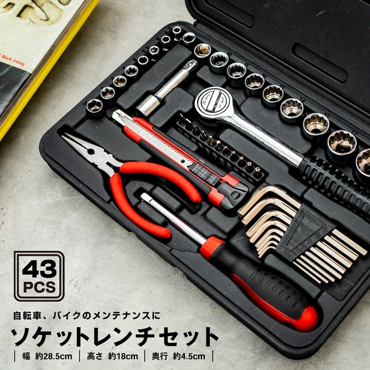 oDIY o工具 o手工具 oDIY女子 oDIY初心者におすすめ ◇◇ ●セット内容 【材質】 ・ラチェットハンドル差込角9.5mm 【炭素鋼】 ・エクステンションバー75mm差込角9.5mm 【炭素鋼】 ・ソケット差込角9.5mm 【炭素鋼】:10、11、12、13、14、15、17、19、21mm ・ソケット差込角6.3mm 【炭素鋼】:4.5、5、5.5、6、7、8、9、10mm ・ソケットアダプター差込角9.5mm→角6.3mm 【炭素鋼】 ・丸型ハンドル差込角6.3mm 【炭素鋼】 ・ビットアダプター差込角6.3mm 【炭素鋼】 ・ドライバービット 【CR-V】:+0、+1、+2、+3、-4、-6 ・トルクスビット 【CR-V】:T8、T10、T15、T20、T25 ・L型六角棒レンチセット 【炭素鋼】:1.5、2、2.5、3、4、5、5.5、6mm ・万能ラジオペンチ150mm 【炭素鋼】 ・S型カッター 【SK5】 商品サイズ:W280xD175xH45mm 商品重量:1.53kg