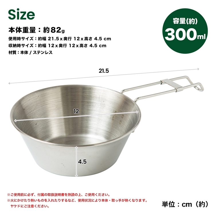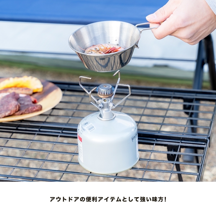 oアウトドア oキャンプ・レジャー用品 oアウトドア初心者におすすめ oBBQコンロ oアウトドア雑貨 ◇◇ 【仕様】 ●サイズ(約):約幅215×奥行120×高さ45mm ●材質:本体/ステンレス ●容量(約):300ml 【使用上のご注意】 ※本品はレジャー用品です。 ※本来の用途以外には使用しないでください。 ※初めて使用する前は食器用洗剤でよく洗浄してから使用してください。 ※火にかけたり熱いものを入れたりするなど、使用状況により本体・取っ手が熱くなります。ヤケドなどに十分ご注意ください。 ※空焚きや、空焚きに近い状態で使用すると、焼けて変色します。 ※使用後は、食器用洗剤でよく洗い、乾いた布などで水気をよく拭き取り、乾燥した場所に保管してください。 ※汚れや水気が付着したまま放置したり、つけ置き洗いはしないでください。サビの発生する原因になります。 ※中古販売・レンタル業での使用・販売・譲渡の履歴のあるものは商品破損・損害に関しての一切の責任を負いかねますのでご了承ください。