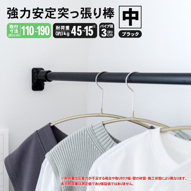 o生活用品 o風呂・洗濯・収納 o突っ張りポール・棚 o新生活・突っ張りポール・棚 oひとり暮らし oブラック o突っ張り・おすすめ2022 ◇◇ 【サイズ】約幅1100−1900×奥行40×高さ70mm 【仕様】 ●パイプ径:(約)30mm ●材質/パイプ:スチール(エポキシ樹脂紛体塗装) 樹脂部品:ABS樹脂・ポリプロピレン樹脂・合成ゴム 金具類:スチール(メッキ) ●取り付け寸法(約)110〜190cm ●耐荷重:45〜15kg ※耐荷重は圧着力が不足する場合や取り付け幅・壁の材質・施工状態により異なります。 ※表示耐荷重は測定値であり保証値ではありません。 【使用上のご注意】 ●本品は屋内用です。 ●本品はご家庭用です。業務用での使用はしないでください。 ●本来の用途以外には使用しないでください。 ●表示寸法の範囲内で使用してください。 ●表示耐荷重以内で使用してください。(耐荷重は測定値であり保証値ではありません) ●パイプに防錆油が付着している場合があります。衣類などに付かないよう拭き取ってください。
