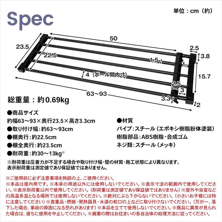 o生活用品 o風呂・洗濯・収納 o突っ張りポール・棚 o新生活・突っ張りポール・棚 oひとり暮らし oブラック o突っ張り・おすすめ2022 ◇◇ 【サイズ】約幅630−930×奥行235×高さ33mm 【特長】 ●マットブラックノ伸縮突っ張り棒 ●伸ばした部分も棚だからたっぷり収納 ●クローゼット・押入れ・トイレなどに 【仕様】 ●材質/パイプ:スチール(エポキシ樹脂紛体塗装) 樹脂部品:ABS樹脂・合成ゴム ネジ類:スチール(メッキ) ●取り付け幅(約)63〜93cm ●棚奥行(約)22.5cm ●棚全奥行(約)23.5cm ●耐荷重:30〜13kg ※耐荷重は圧着力が不足する場合や取り付け幅・壁の材質・施工状態により異なります。 ※表示耐荷重は測定値であり保証値ではありません。 【使用上のご注意】 ●本品は屋内用です。 ●本品はご家庭用です。業務用での使用はしないでください。 ●本来の用途以外には使用しないでください。 ●表示寸法の範囲内で使用してください。 ●表示耐荷重以内で使用してください。(耐荷重は測定値であり保証値ではありません)