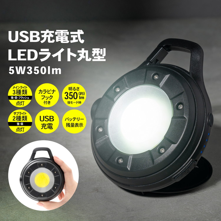 o工具 o作業用具・用品 oハンドランプ o充電式 o丸型 oLEDライト ◇◇ 【特長】 ●USB充電式LEDライト丸形5W350lm ●明るい大型LED ●マグネットで簡単固定 ●USB充電 ●(約)350ルーメン(メインライト強モード時) ●3種類点灯モード(メインライト/サブライト/フラッシュ) ●カラビナフック ●バッテリー残量表示機能付 【仕様】 [本体] ●電球:5W LED/1W LED ●内蔵電池:リチウムイオン電池 3.7V/1800mAh ●充電時間:約3.5時間 ●明るさ(約):メインライト 強:350lm/弱:100m サブライト 強:80lm/弱:20lm ●点灯時間(約):メインライト 強:2.5時間/弱:4.5時間 フラッシュ 3.5時間 サブライト 強:8時間/弱:11時間 ●USB端子:Microb USB 【付属品】 ●USBケーブル(充電用)約43cm 【注意】 ●本品はお客様の責任においてご使用ください。 ●幼児の手の届かないところで本品を保管してください。