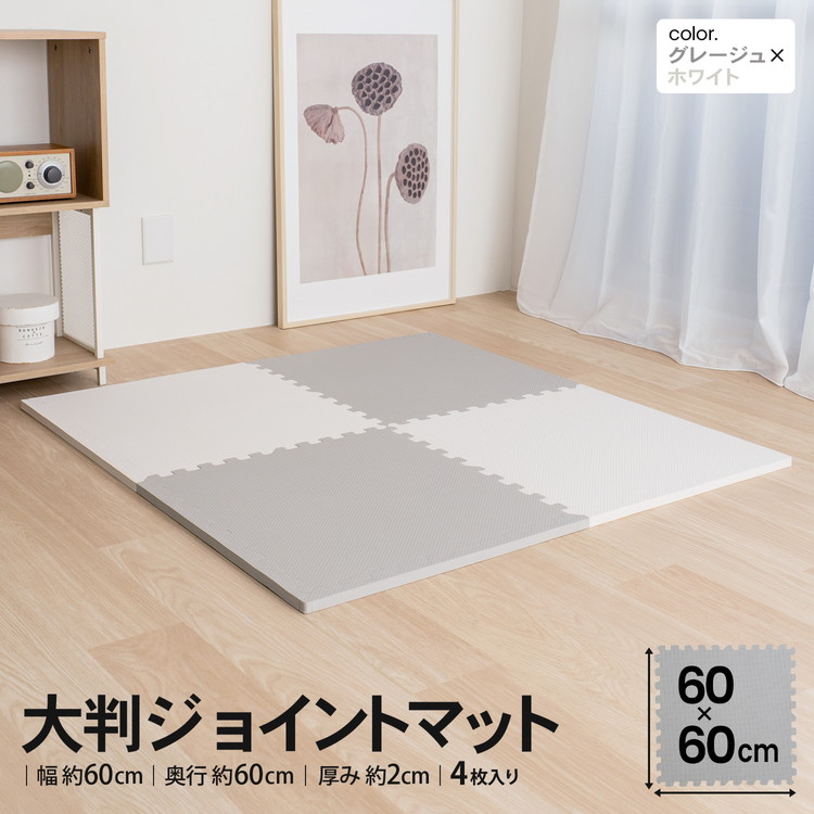 ジョイントマットo4枚入oふち付o大判oふち付o防音対策oノンホルムアルデヒドoシックハウス対策o抗菌o防臭o床暖房対応o手洗いoグレージュ/ホワイトoフロアマットoおしゃれoプレイマットoサイドパーツ付き ◇◇ 【特長】 ●約2cm厚で防音 遮音等級ΔLL(I)ー4 ●大判サイズで敷き込み簡単 ●大判サイズ ●防音 ●ノンホルムアルデヒド ●シックハウス対策 ●抗菌防臭 ●床暖対応 ●手洗いOK ●ジョイント形状B ●フリーカット可 【仕様】 ●1枚あたりサイズ(約)60×60厚さ約2cm※ふち部分含まず(実寸57.6cmx57.6cm) ●材質:ポリエチレン ●セット内容:マット/4枚 ふち/コーナー用×4本 サイド用×4本(予備1本含む) ●生産国:ベトナム ●ジョイント形状:Bタイプ ※タイプが同じであれば、他カラー・サイズでも 本体同士のジョイントは可能です。 ※コーナー用ふちは除く 【取り扱い上のご注意】 ※急に飛び乗ると滑ることがあります。マットには静かに乗ってください。
