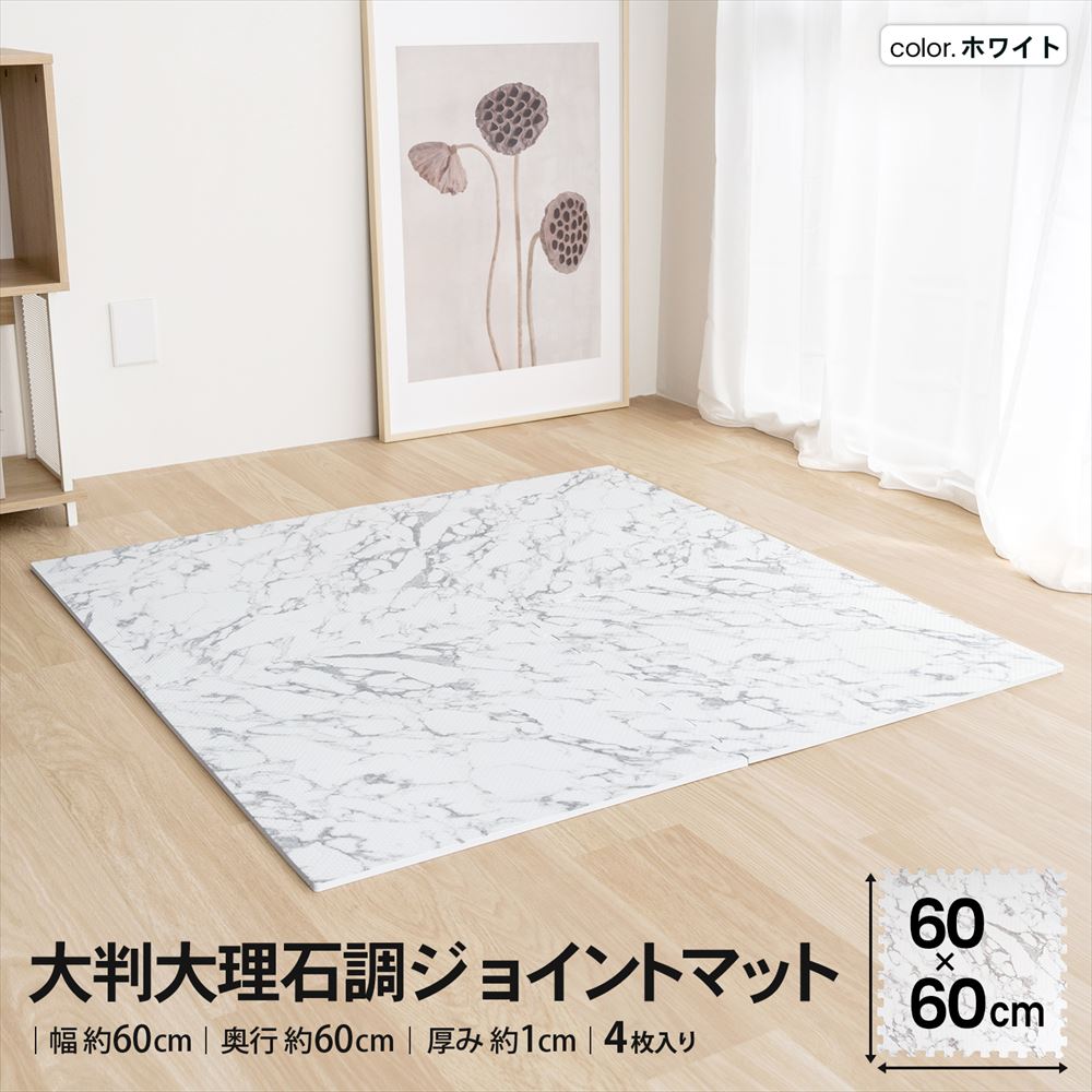 ◇◇ 【特長】 ●お部屋になじみやすい大理石調デザイン ●大判サイズで敷き込み簡単 ●ノンホルムアルデヒド ●シックハウス対策 ●床暖対応 ●手洗いOK ●ジョイント形状A ●フリーカット可 【仕様】 ●1枚あたりサイズ(約)60×60厚さ約1cm※ふち部分含まず(実寸57.6cmx57.6cm) ●材質:ポリエチレン ●セット内容:マット/4枚 ふち/コーナー用×4本 サイド用×4本 ●生産国:ベトナム ●ジョイント形状:Aタイプ ※タイプが同じであれば、他カラー・サイズでも 本体同士のジョイントは可能です。 ※コーナー用ふちは除く 【取り扱い上のご注意】 ※急に飛び乗ると滑ることがあります。マットには静かに乗ってください。 ※床の種類によって、マットが滑る場合があります。市販のすべり止めシートとの併用をお勧めします。 ●製造工程の都合上、離型剤としてシリコーンを使用しているため、製品の表面が滑りやすくなっている場合があります。その際は、中性洗剤を浸した布でよく拭き取ってからご使用ください。