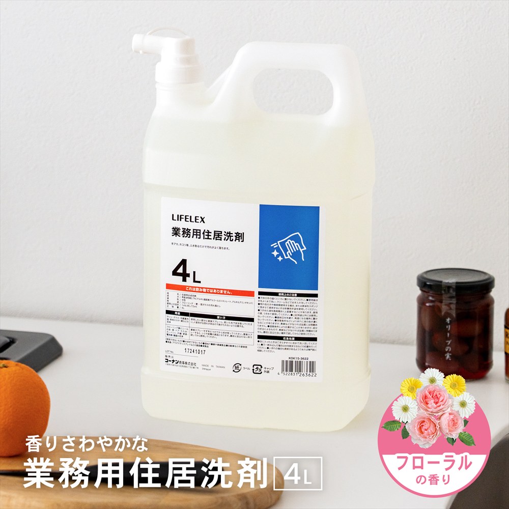 液体洗剤 洗剤 住居用洗剤 住居洗剤 フローラルの香り 業務用 洗剤 詰め替え 大容量 特大 ◇◇ 【特長】 ●手アカ、ホコリ等、ふき取るだけで汚れがよく落ちます。 【仕様】 ●成分:界面活性剤0.7%(アルキル脂肪族アルコールエトキシレート、アルキルアミンオキシド) ●液性:中性 ●用途:フローリング・壁・窓ガラスの汚れ落とし ●使用上の目安:1m2に対して5ml ●正味量:4L 【使用できないもの】 ●水拭きできないもの●漆ぬり●銅や真鍮製品●自動車などの塗装面●液晶・プラズマディスプレイなどの画面●革製品 【洗い方】 ●サッシ・ガラス・冷蔵庫外面・照明のカサ・鏡などの洗浄 使用したい部分に直接スプレーし、乾いた布で拭き取ってください。※変色する恐れがあるので液がたれないよう注意する。 ●フローリング兼ビニールの床・壁・ドア・たたみ・カーペット・戸棚・家具・電気類・機器の洗浄 直接スプレーせず布につけてから拭き取ってください。直接スプレーすると、シミや故障の原因となります。最初に目立たない所で試してから使用してください。
