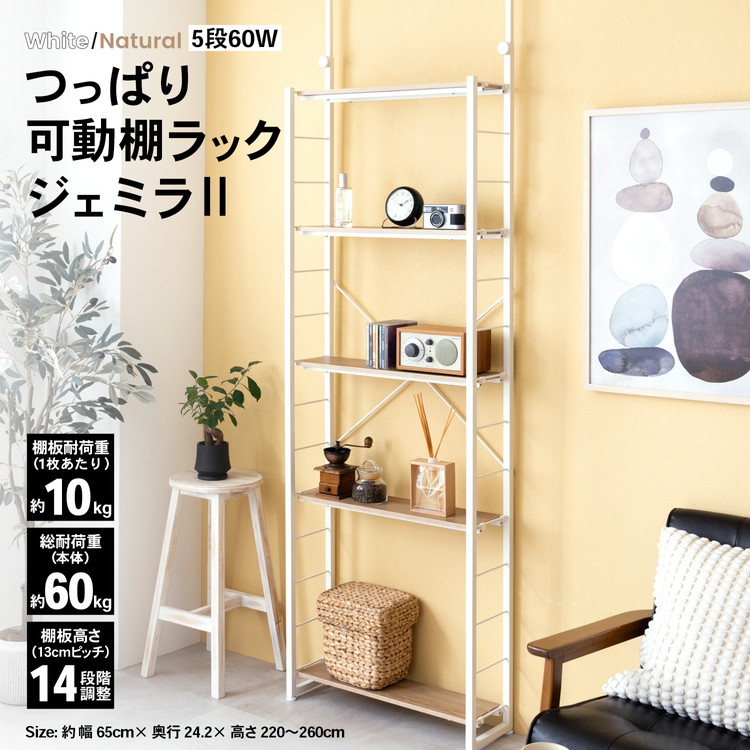 o収納・インテリア o収納用品 o棚・ラック o可動棚ラックシリーズ oつっぱり可動棚ラックo可動棚ラックジェミラII ◇◇ お客様組立品です 【特長】 ●薄型設計で壁面収納にぴったり! ●複数台で連結可能 【仕様】 ●サイズ(約):幅65×奥行24.2×高さ220〜260cm ●甲材の表面材:強化紙貼パーティクルボード ●構造部材:本体/金属(スチール)・エポキシ樹脂塗装、アジャスター/ポリプロピレン ●耐荷重(約):棚板/1枚あたり10kg、総耐荷重/60kg ※耐荷重は測定値であり、保証値ではありません。 ●組み立て時間(約):2人以上で30分 ●組立時ドライバー要 ●組立パーツ在中