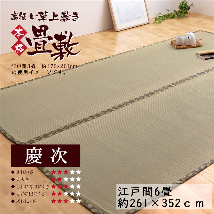 ◇◇ ※天然素材のため、ささくれ等があります。ご使用の際にご注意ください。 ※い草は植物で、自然素材のものですので、化学繊維などと比べて切れやすい性質があります。織りあげ時の摩擦や乾燥などの影響で切れてしまった場合、い草が切れて飛び出すことことがございます。こちらはイ切れと呼ばれるもので不良ではございませんので爪切り・はさみ等でカットしてお手入れをお願いいたします。 【特長】 ●人にも環境にもやさしい天然素材100% 材質:い草100% 縁:ポリエステル100% 天然い草を100%使用し、肌ざわりはさらっと心地よく。 ●両面使用できるので、日焼けや色あせが気になってきたら裏返してお使いいただけます。 ●防臭機能でお部屋さわやか 自然の力でニオイを軽減。アンモニア、酢酸など不快なにおい成分を吸収し、お部屋をクリーンにする効果があります。 ●サラリと心地よい清涼感 いぐさは天然のエアコンといわれお部屋の湿度をコントロールします。【備考】 江戸間3帖の使用イメージです