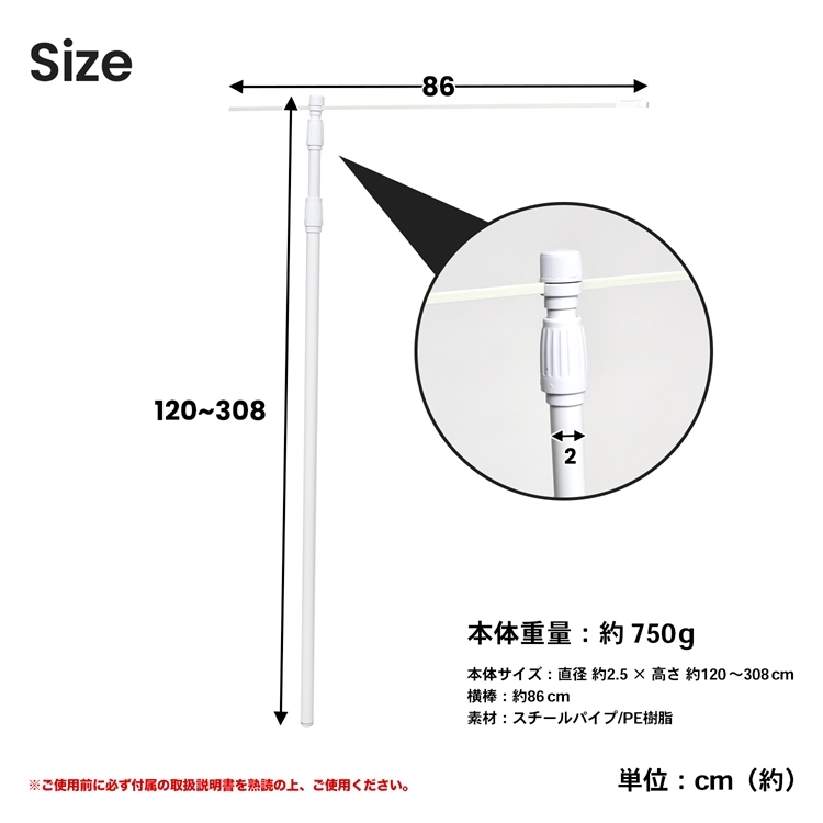 oエクステリア oガーデン o日よけ oガーデンフェンス oお庭造り・メンテ oポール ◇◇ 【サイズ】伸縮サイズ:1.2〜3m 【仕様】 ●パイプ色:白 ジョイント樹脂部:白