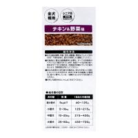成分:穀類(とうもろこし)、糟糠類(小麦ふすま)、肉類(チキンミール)、豆類(大豆ミール)、野菜類(ビートパルプ、人参)、油脂類(チキンオイル)、コーングルテンミール、でんぷん類(キャッサバ根)、魚介類(フィッシュミール)、ユッカ抽出エキス、ミネラル類(ナトリウム、塩素、カリウム、亜鉛、マンガン、銅、鉄、コバルト、ヨウ素、セレン)、ビタミン類(A、D、E、B1、B2、C、パントテン酸、ナイアシン、B6、葉酸、B12、コリン)、酸化防止剤(ミックストコフェロール、ローズマリー抽出物)