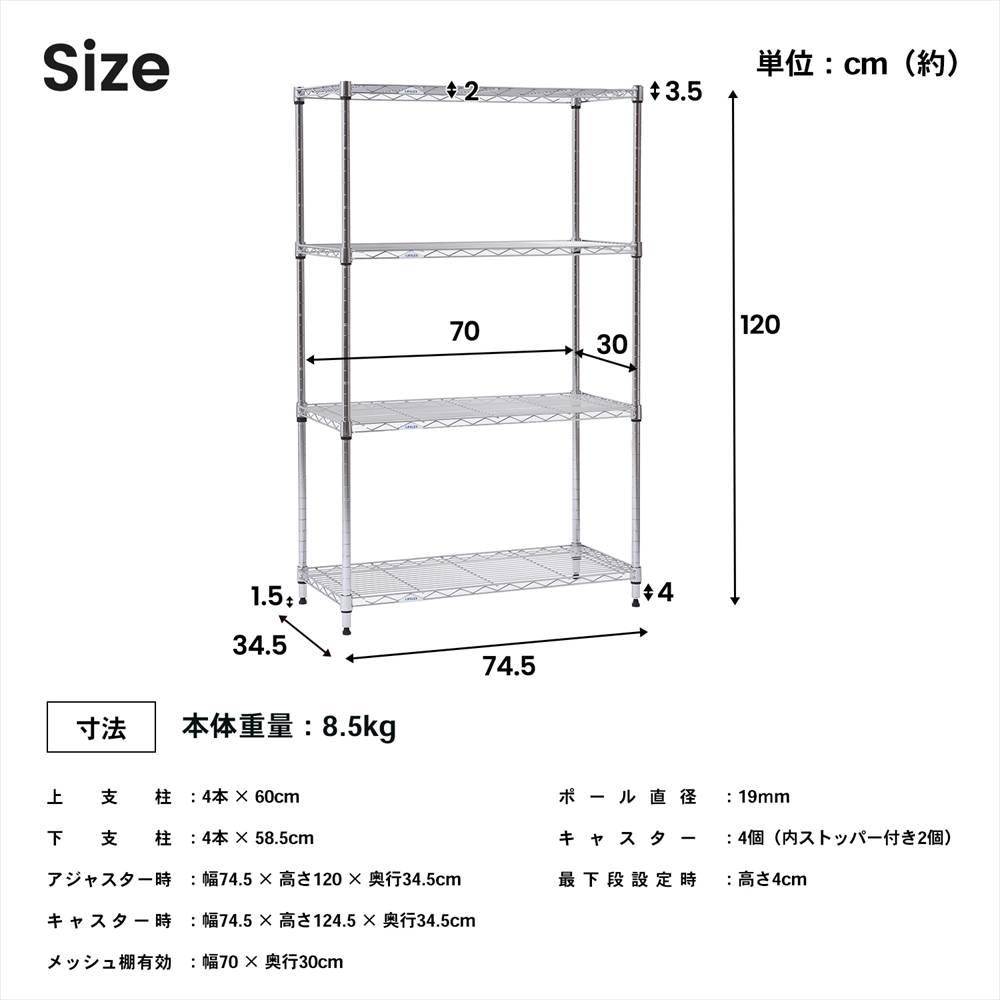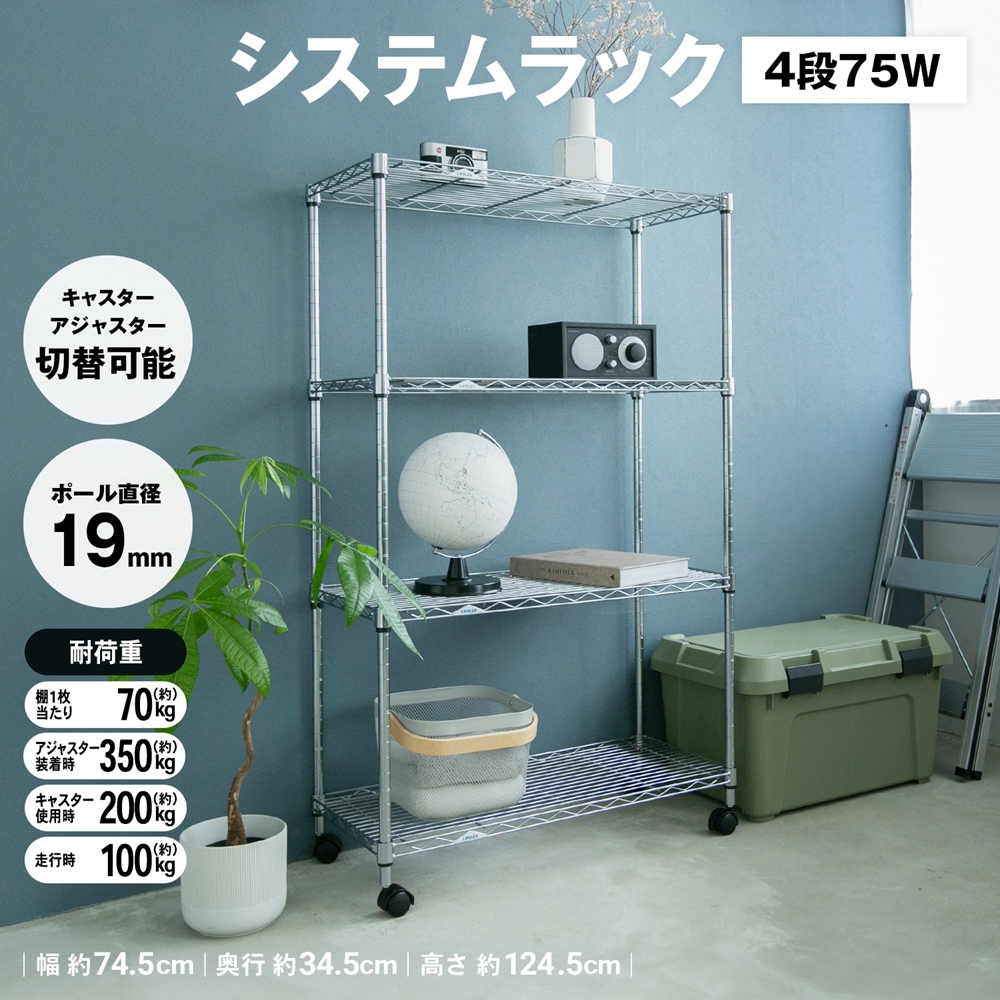 o収納・インテリア o収納用品 o棚・ラック oシステムラックα・パワーラックα o新生活・収納用品 oひとり暮らし ◇◇ 【サイズ】幅74.5×奥行34.5×高さ124.5cm 【仕様】 ●静止耐荷重:シェルフ1枚当たり約70kg ●全体耐荷重:350kg ●キャスター耐荷重(静止時):200kg (走行時):100kg ●サイズ:幅74.5×奥行34.5×高さ124.5cm ●ポール径:19mm ●材質:スチール(棚板・ポール部分)、ナイロン(アジャスター部分) ●キャスター付き 【備考】 ※お客様組立式