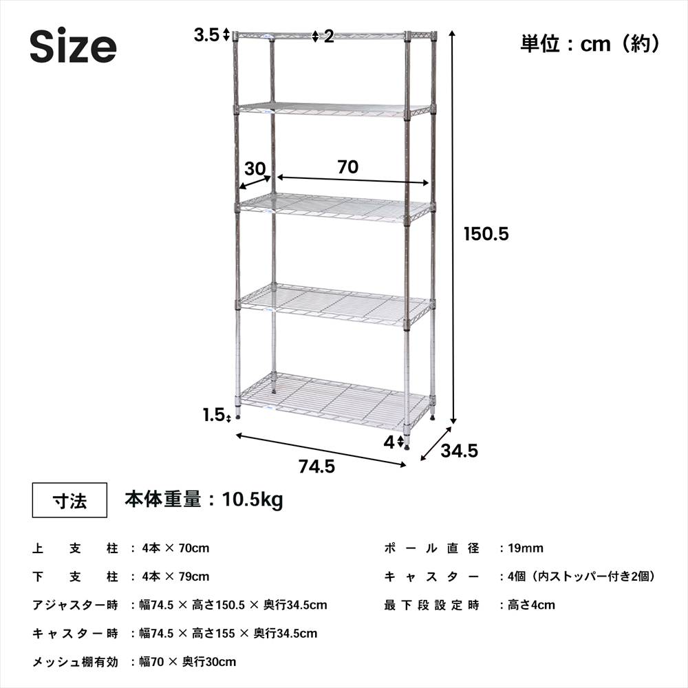 ●材質/棚板:鉄 ポール:鉄 アジャスター:ナイロン ポール径(Φ):19mm