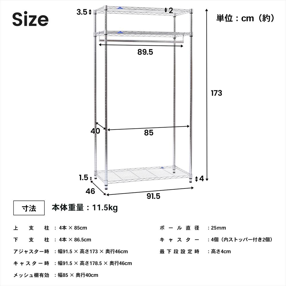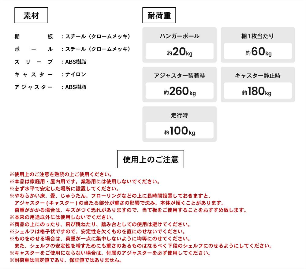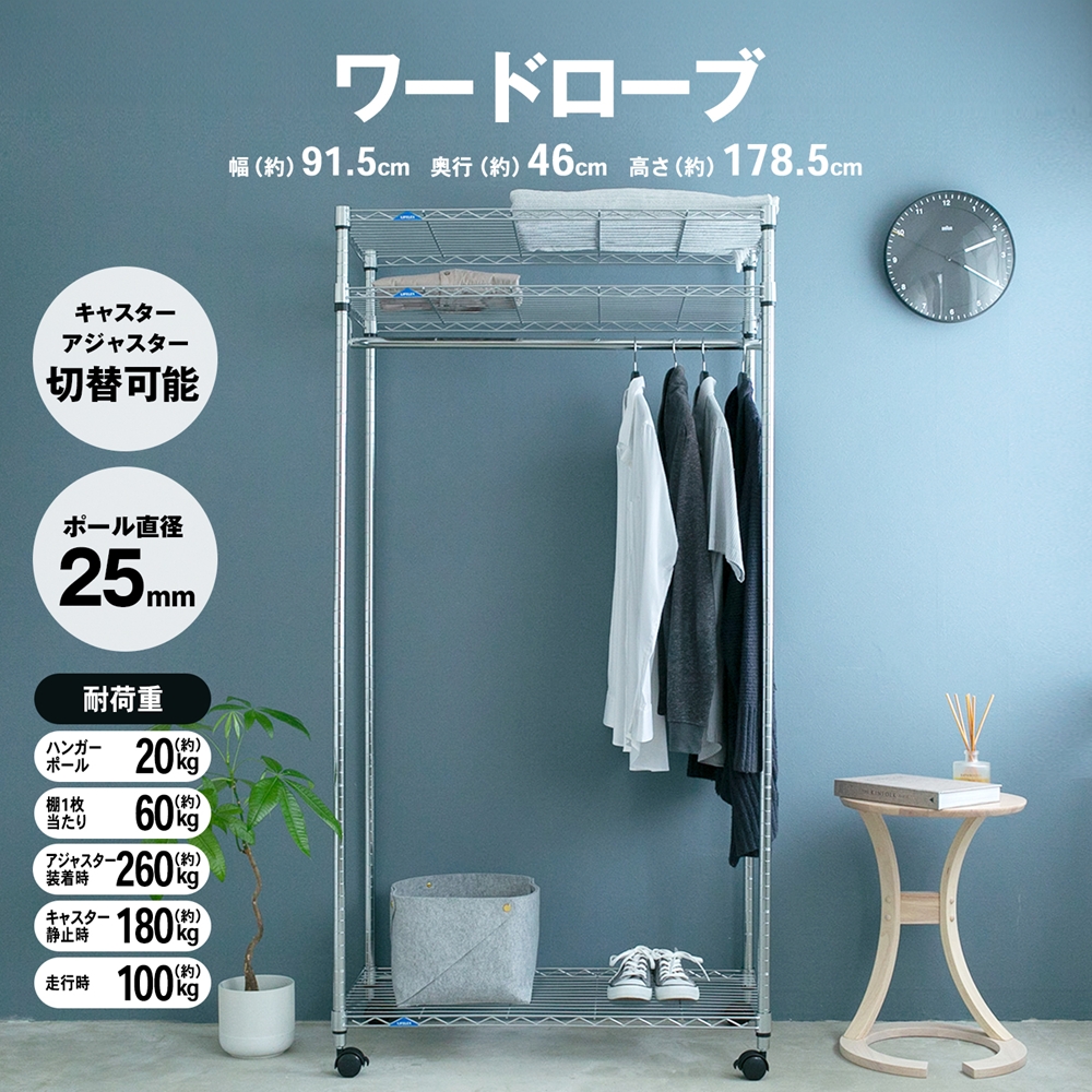 o収納・インテリア o収納用品 o棚・ラック oシステムラックα・パワーラックα o新生活・収納用品 oひとり暮らし oパイプハンガー・ワードローブ ◇◇ 【サイズ】約幅91.5×奥行46×高さ178.5cm ●材質:鉄 ●棚板耐荷重 1枚当たり60kg ●ハンガー耐荷重20kg ●全体耐荷重:260kg ●キャスター耐荷重(静止時):180kg (走行時):100kg ※こちらの商品はお客様組立品となります。 ※画像は使用イメージです。