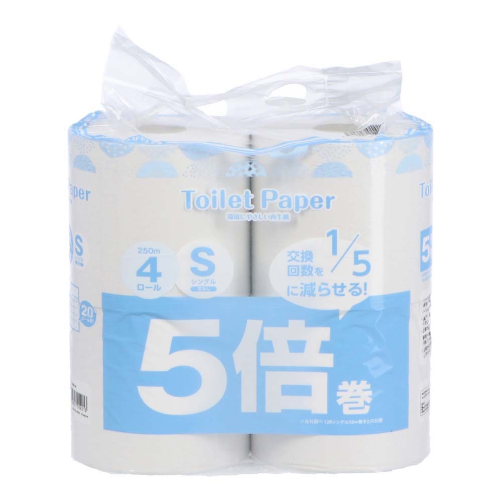 ◇◇ 【特長】 ●1ロールで5ロール分の超長巻仕様 ●超長巻だから省スペースで収納 災害備蓄にもおすすめ ●5倍巻きでも通常ロールと大きさは変わりません。 ●4ロールで20ロール分!※当社調べ 12Rシングル50m巻きと比べ 通常:1ロール 50m、本製品:1ロール 250m 【仕様】 ●寸法(約):幅107mm×長さ250m 【注意】 ●トイレ詰まりの原因となりますので一度に大量の紙を流さないでください。 ●トイレに外装を流さないでください。 ●室外や、湿気の多い場所での長期保管は避けてください。 ●上質の古紙から生まれた環境にやさしい製品です。 ●緑茶から抽出した天然由来の消臭成分を使用しております。 ●消臭成分は巻き取りの最後の部分に塗布しております。