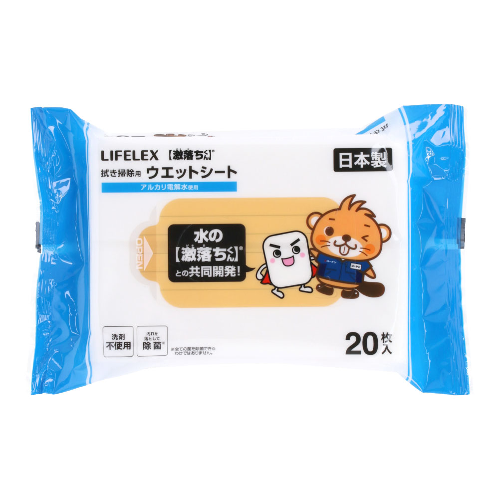 oコーナン 激落ち ◇◇ 【特長】 ●LIFELEX×激落ちくんがコラボレーション 日本国内工場生産により、安定した品質を実現 ●水を電気分解して得られるアルカリ電解水を使用したウエットシートです。 ●水拭きでは取れない油汚れなどの酸性汚れをマイナスイオンが包み込んで浮かせて落とします。 ●小さなお子様やペットのいるご家庭にもお使いいただけます。 ●各社のフローリングワイパーに取り付けられます。 【仕様】 ●材質:ポリエステル、レーヨン ●液性:弱アルカリ性 ●成分:水、エタノール、アルカリ電解水、pH安定剤、除菌剤 ●サイズ:約300×200mm ●枚数:20枚 【使えないもの】 ●水拭きできないもの(桐・白木等)、水性ペンキや漆・ニス塗りのもの、皮革類、アルミ、銅、真鍮、テレビ・パソコンの画面 【使用上の注意】 ●本品は清掃用シートです。用途以外には使用しないでください。 ●顔や身体には使用しないでください。 ●子供の手の届かないところに保管してください。