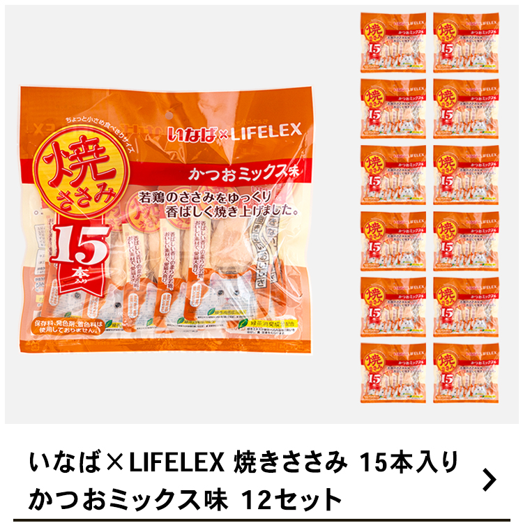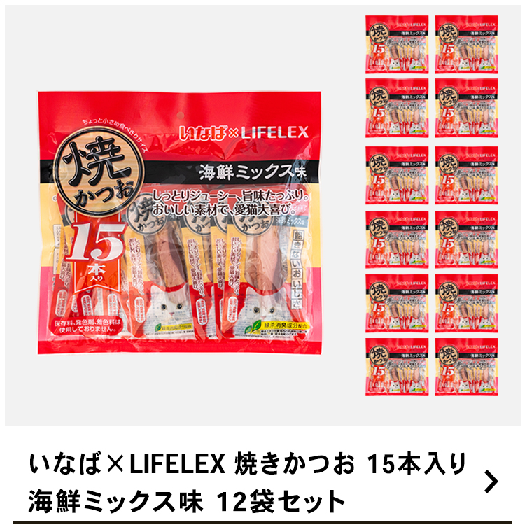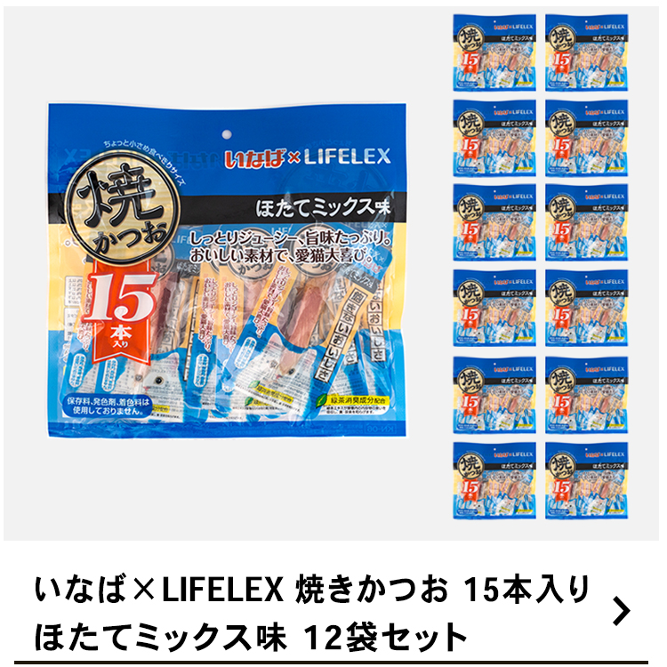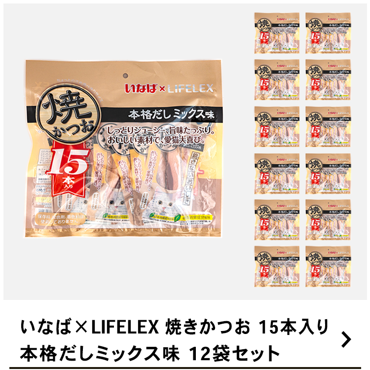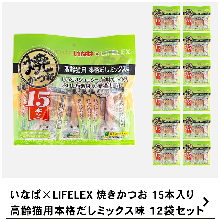 ◇◇【特長】 ●いなば×コーナン 焼きかつお 本格だしミックス味 かつお節エキス、煮干しエキスをミックス。 香ばしさと旨みのバランスが抜群です。 ●おいしい素材で猫ちゃん大喜び! しっとりジューシー、旨味たっぷり 新鮮な宗田鰹をじっくり焼き上げ、煮干しエキスをミックス。 開けた瞬間、猫ちゃんの食欲をそそる香ばしさが広がります。 人肌くらいに温めるとさらに喜んで食べます! ●着色料・保存料不使用で安心! 緑茶消臭成分を配合 緑茶エキスが腸管内の内容物の臭いを吸着し 糞・尿臭を和らげます。 毎日のコミュニケーションに、うれしい配慮。 ●ちょっと小さめ食べきりサイズ。 ご褒美のおやつや、いつものごはんのトッピングに。 食べきりサイズだから毎日気軽に「開けたての美味しさ」を。 【仕様】 ●内容量:15本【備考】 ※上記表示価格は、12個セット販売価格となります。