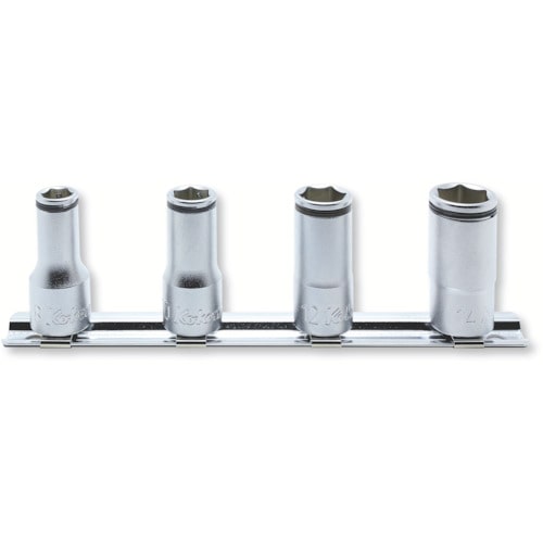 ◇◇ 【特長】 ●2個のスチールボールがボルト、ナットをしっかりつかみ、安心して確実な作業ができます。 ●ボルト/ナットを落とさないナットグリップソケットです。 ●マグネットを使用していないため鉄粉等の付着が少なく、また非磁性のボルト/ナットも掴むことができます。 【仕様】 ●差込角(mm):9.5 ●セット内容:3350X-8、10、12、14 ●セット内容(点):4 【材質/仕上】 ●クロムモリブデン鋼(SCM435) 【セット内容/付属品】 ●ソケットレール
