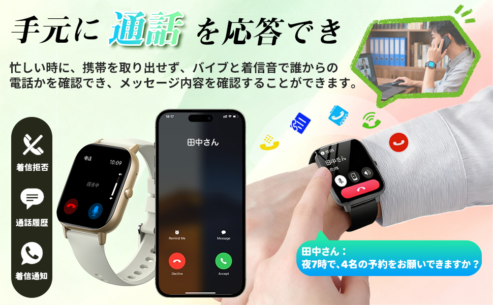 主な機能:睡眠管理/着信通知/拒否/情報のヒント/その他のリマインダ/複数の運動モード/クロック表示/ひゃくへんダイヤル/カスタム壁紙/スリープモニタ/歩数、距離、カロリーを計る