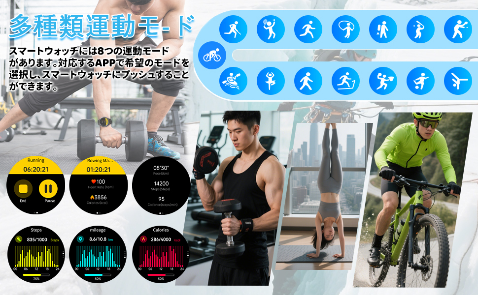さらに、マートウォッチ本体にウォキング、ランニング、自転車、バドミントン、サッカーなどのスポーツモードがあり、体の状況により運動目標を設定してしっかり健康管理を実現できます。