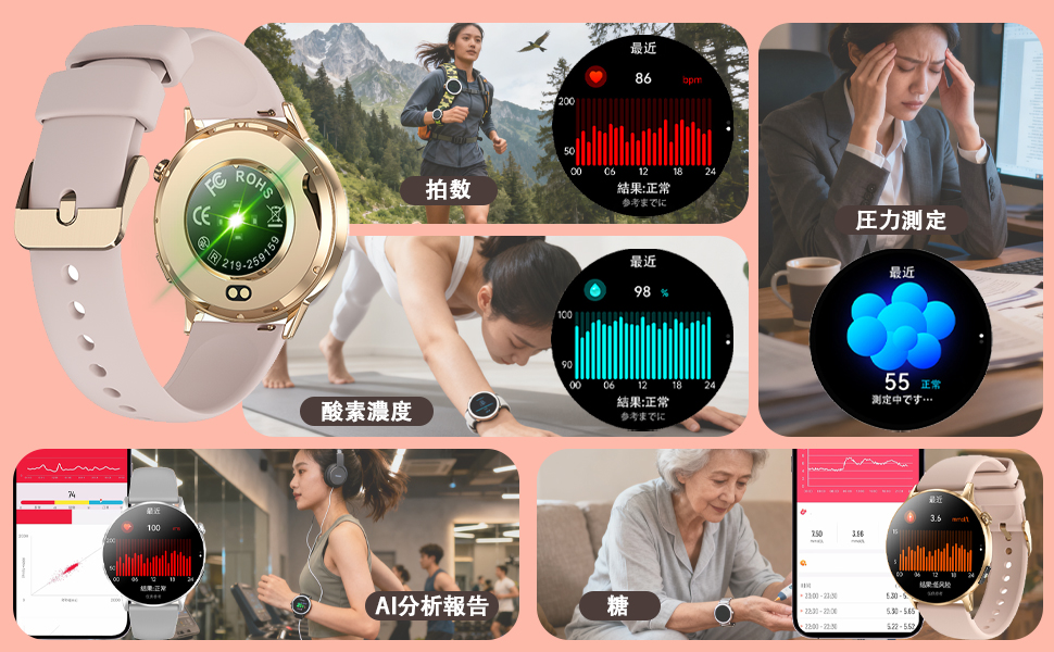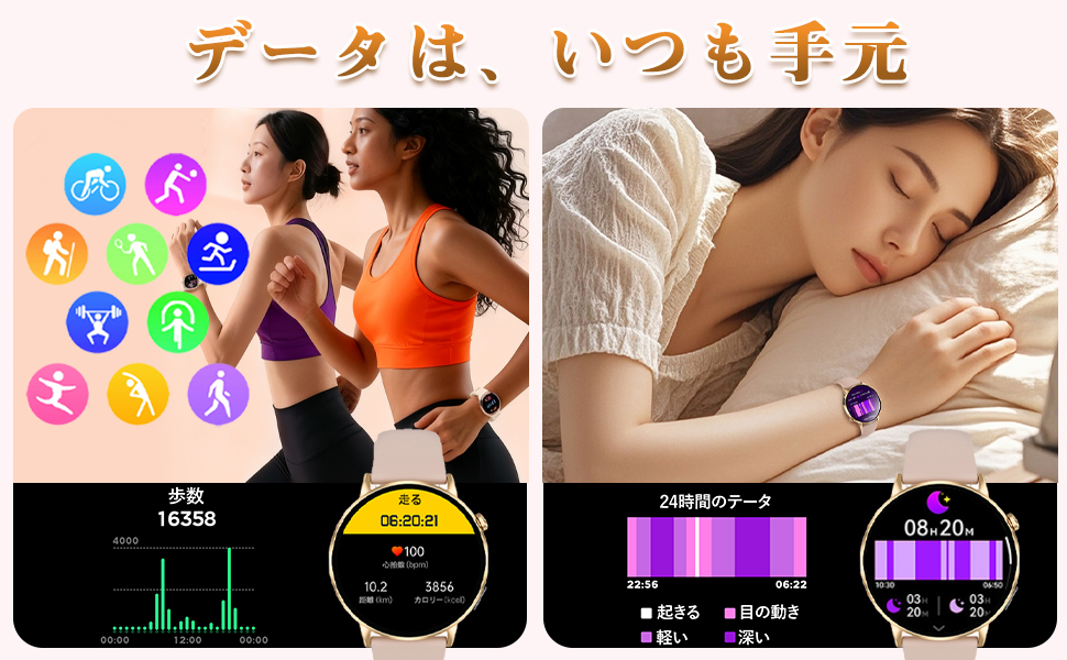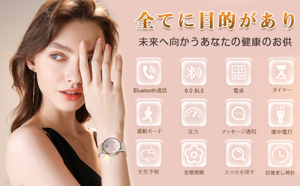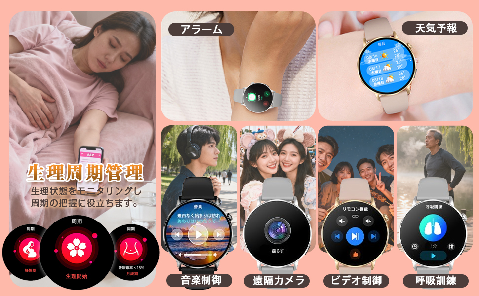カメラ制御、天気予報、呼吸トレーニング、ゲーム、電卓機能、ストップウォッチ、生理周期管理などうれしいな機能盛りたくさんです。スマートウォッチに内蔵している専用センサーを通して、トレーニング効果を最大化して、健康を最適化できます。基礎代謝や運動消費カロリーを正確に記録し、体重管理を支援します。簡単に健康管理ができ、日常生活をより豊かにしてくれます。