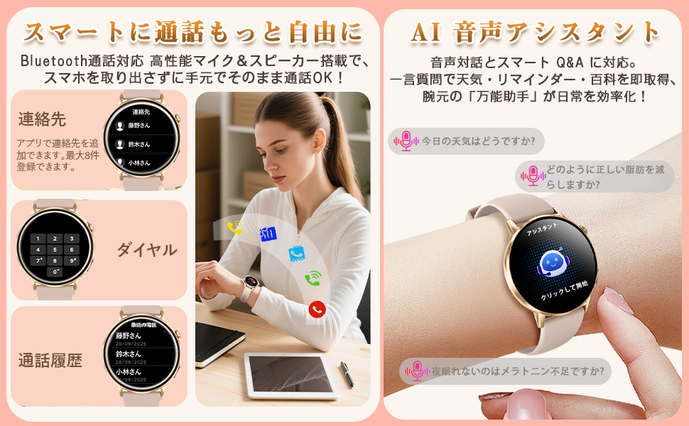 業界をリードするAMOLED材料アプリケーションを使用した3D高精細スクリーンは、主にノートブックディスプレイに使用されます。画面には、従来のスマートウォッチの画質を大幅に向上させる、高い表示品質と広い表示領域という特徴があります。1.32インチのディスプレイ画面を搭載し、これまでにない快適な視覚体験とフルスクリーン タッチ デザインを実現します。スマートウォッチには最新のBluetooth 5.3テクノロジーが搭載されており、安定性とエネルギー効率が大幅に向上しています。Bluetooth接続後、同期モバイル通信をサポートし、通話記録を保存できます。運動中に簡単に電話に出ることができます。最も重要なことは、いつでも時計を通じて自分の情報を確認できることです。音声アシスタントにも対応しているので、スマホを取り出さなくてもスマートウォッチの音声アシスタント画面から電話をかけることができます。
