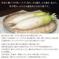 外皮に横ジワが多い、キズ、凹み、大き過ぎ、小さ過ぎ、色むら、形が悪かったりする規格外のB品大根になります。
