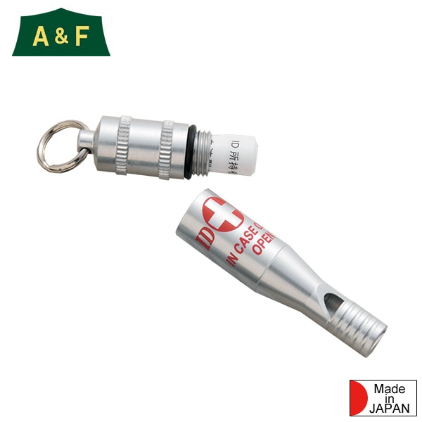 A&F エイアンドエフ IDホイッスルはSOSカプセルと同様、Oリングのついた防水カプセルに、信号用のホイッスルがついています。緊急用、医師、救急要員に必要な事項を伝えたり、身元確認の他、人の注意を引き付けるための信号にも使えます。(JAPAN)