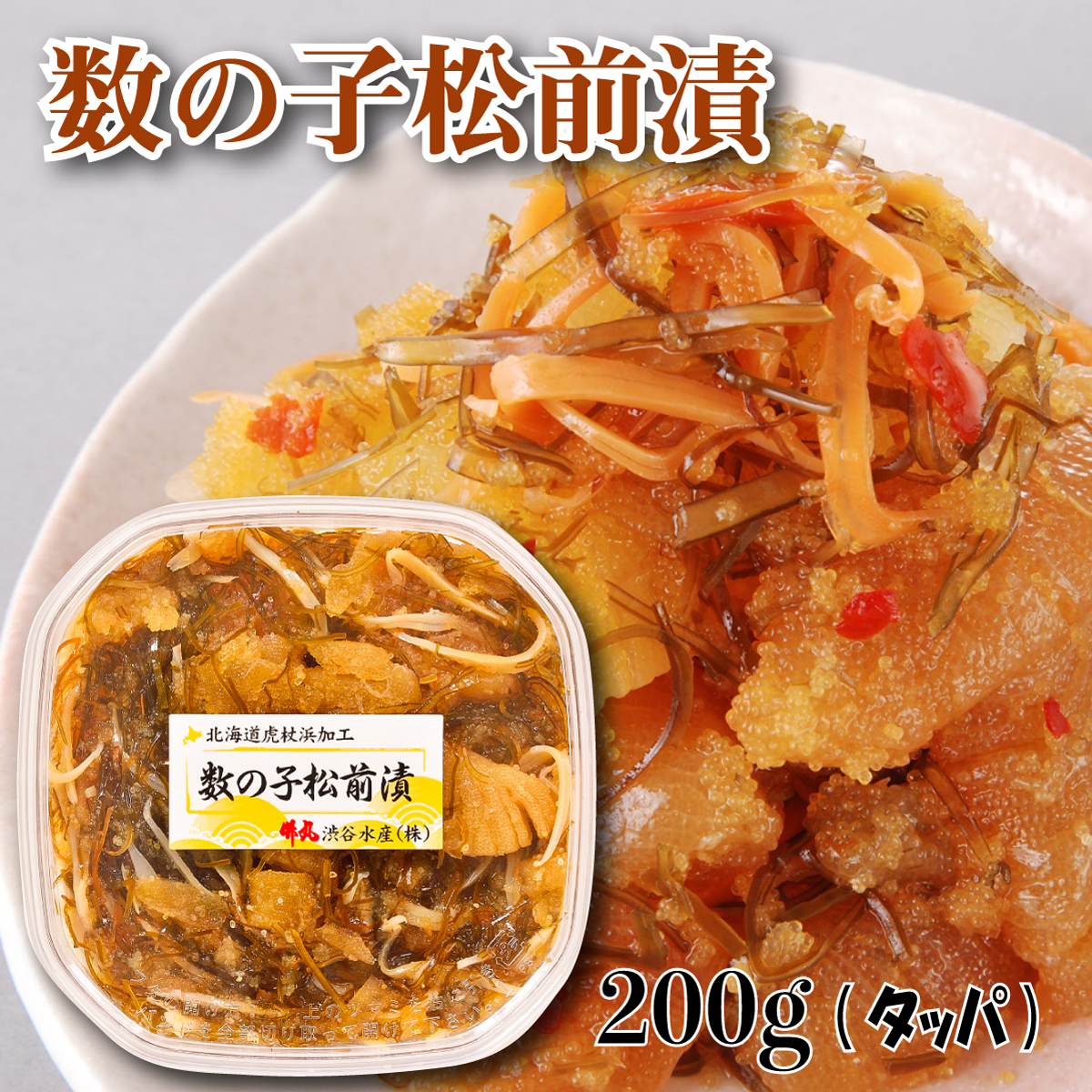 数の子(カナダ産)、醤油、発酵調味料、いか、オリゴ糖、砂糖、真昆布、風味原料(かつお節粉末)、カツオエキス、食塩、がごめ昆布、昆布エキス、たん白加水分解物/ソルビット、調味料(アミノ酸等)、酒精、酸味料、増粘剤(キサンタン)、(一部に小麦、大豆、いかを含む)