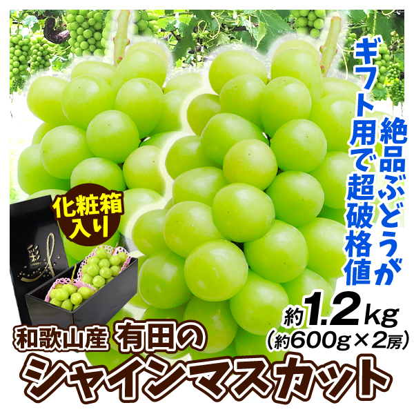 ぶどう 約1.2kg シャインマスカット (約600g×2房) 和歌山産 有田 ギフト 化粧箱入り 種なし 極甘 国華園