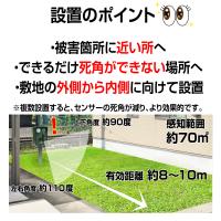 超音波と光とアラーム音で撃退! センサーが上下90度、左右110度、70m2の範囲、8〜10m先まで感知し、超音波(周波数調節可)・ 光で対象動物を近寄らせなくさせます! ソーラー充電とUSBでの充電も可能。防水等級IPX4の簡易防水機能付なので、どこでも気軽に設置できます。背面に引っ掛け穴があるので吊るして使用することも可能です。