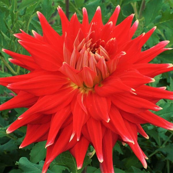 赤い花弁の先に黄色が入り、花火のように美しいダリア。茎が強く、雨風にも強い。超巨大輪:花径30cm以上。秋田国際ダリア園の高品質な球根でお届けします。