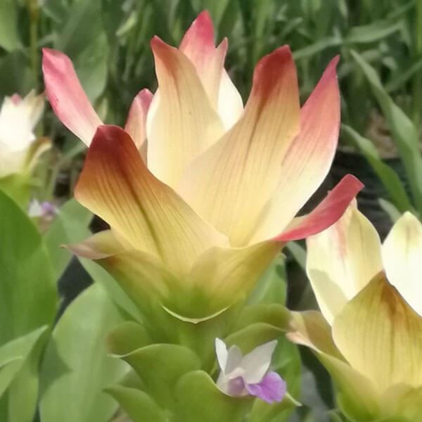 クルクマはエキゾチックな花を真夏に元気よく咲かせます。暑ければ暑いほどよく生長し、花色も大きさも良くなります。花もち抜群で育てやすい。切花やアレンジにもオススメです。