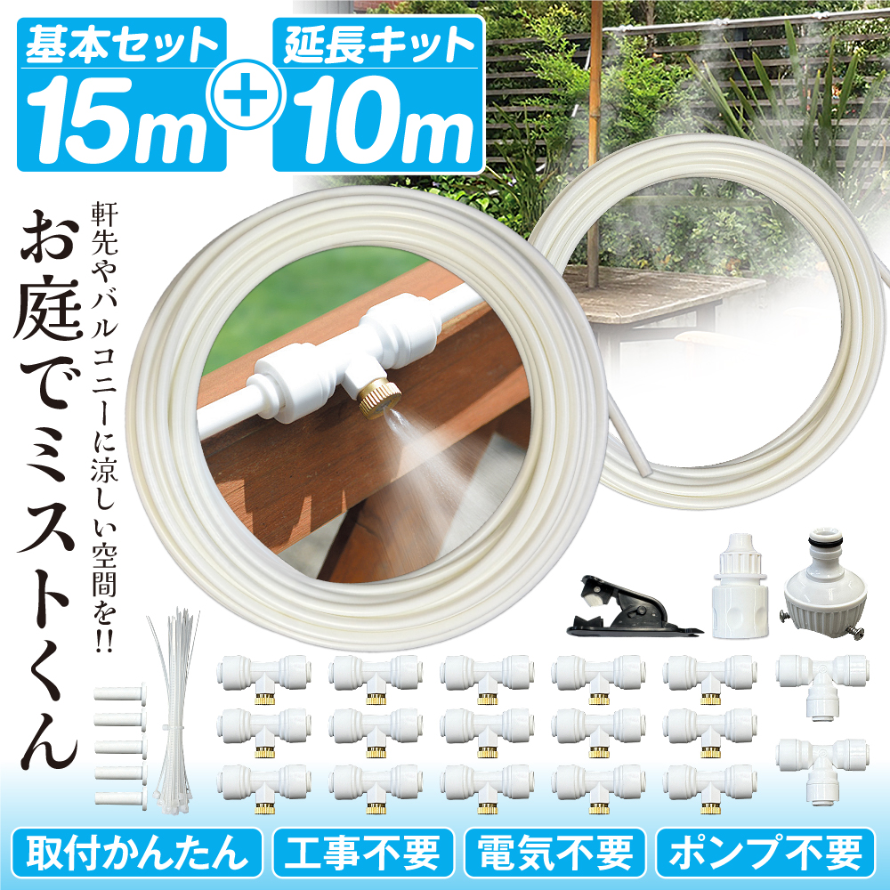 ミストシャワー 熱中症対策 霧 散水機 お庭でミストくん 15m+延長キット10m セット 1組 ミストクーラー ガーデンミスト屋外 ベランダ 工事不要 mist 国華園